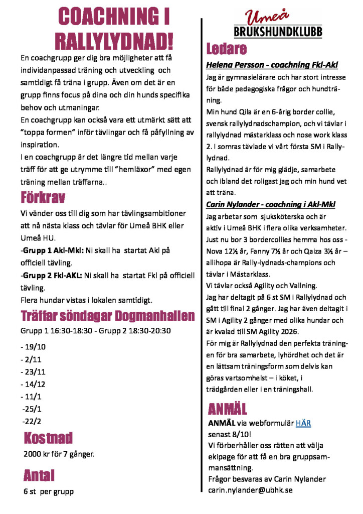 Nu har ni som har tävlingsambitioner och vill ha regelbunden coachning under längre tid chansen att anmäla till nån av våra coachgrupper som startar 19/10.